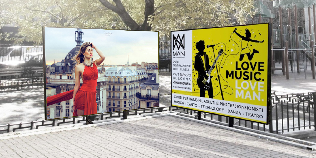 Manifesto in carta blueback 4x3mt diviso in tre tessere da 133cm con un sormonto di 2cm, adatto alle affissioni in esterno su camion vela e cartellonistica stradale.